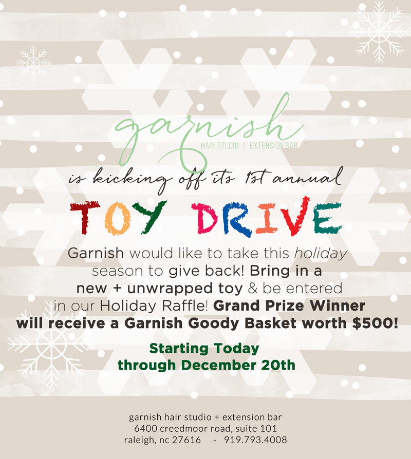 As we enter into the notorious holiday season, we’d like to take this opportunity to do something special with the salon and community for our very 1st year. We will be hosting a Holiday Toy Drive for the women and children of InterAct Raleigh . From now until the 20th of December, we are accepting new, unused, and unwrapped toys to put under our Holiday Tree. Everyone who finds it in their heart to bring a toy into the salon, will be entered into our Garnish Goody Bag Raffle. This is not just your average goody bag, it’s filled with a ton of Garnish quality products along with a $250 gift card to the studio.